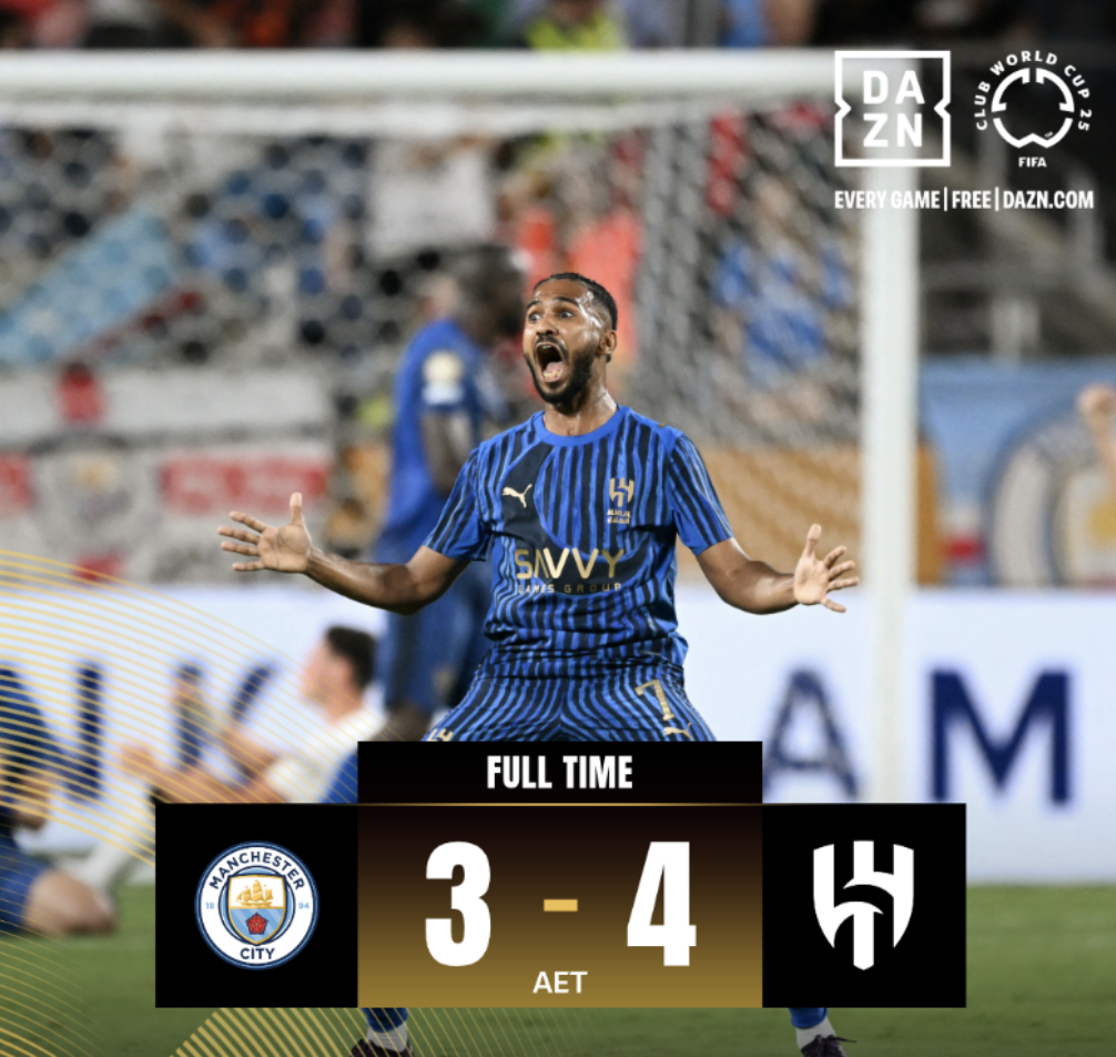 Một trong những cú sốc lớn nhất tại FIFA Club World Cup 2025 đã xảy ra khi Manchester City bị Al Hilal loại khỏi giải đấu. Sau 120 phút rượt đuổi tỷ số nghẹt thở, đại diện Ả Rập Xê Út đã giành chiến thắng chung cuộc 4-3 đầy kịch tính.
